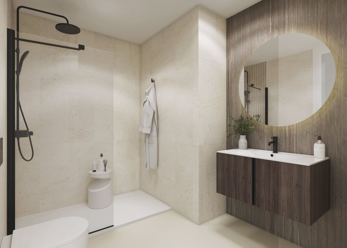 It's also important to mention that we choose super premium finishing materials. All flooring, tiles, and natural stone details in bathrooms, as well as bathroom furniture, showers, and taps, come from Porcelanosa. The windows will be premium double-glazed units with a special sun filter from Cortizo!