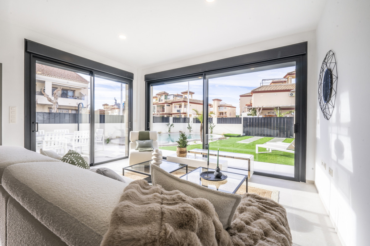 The villas are equipped with a rear private swimming pool with outdoor shower, solarium, terrace areas, fully fitted kitchen and bathrooms with led mirror, lined wardrobes with drawers, interior/exterior lighting, pre installed air-conditioning. Feature angled walls and stone cladding to the front and stairwell, really makes this villa pop with style.