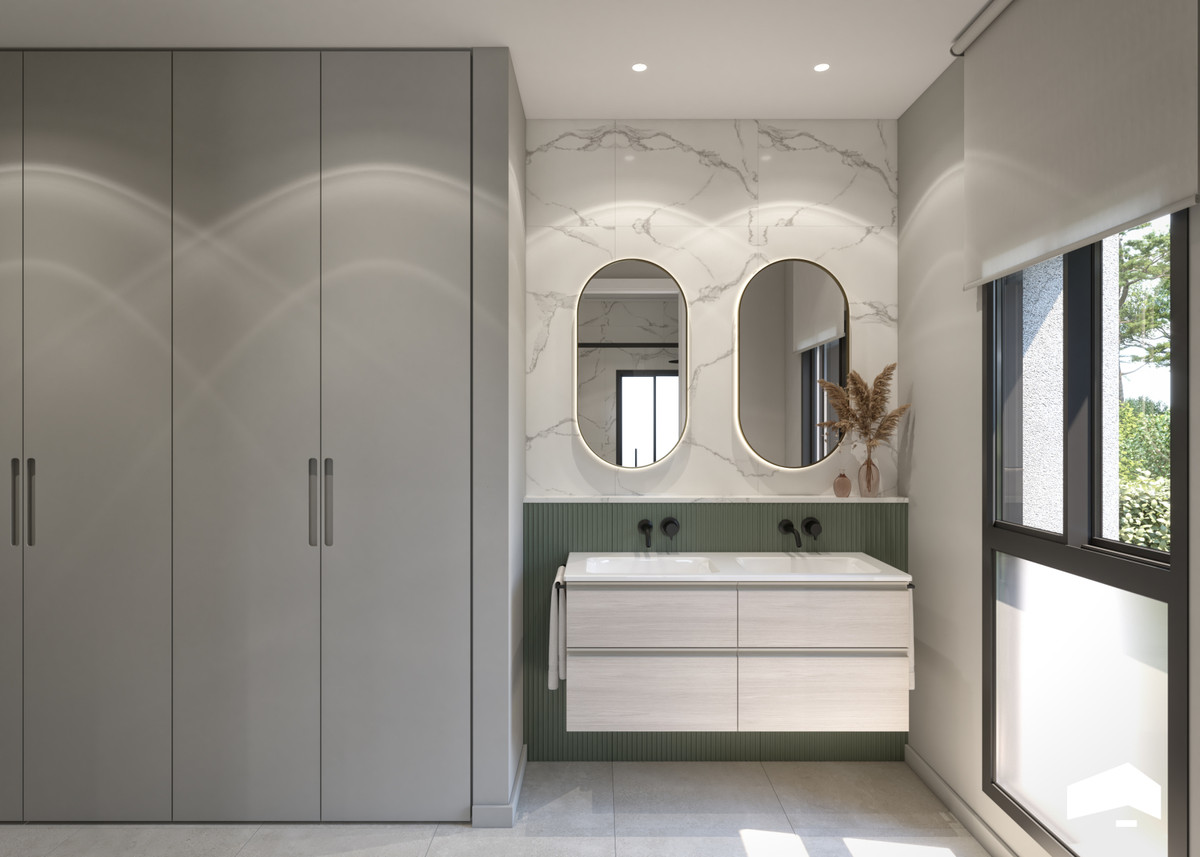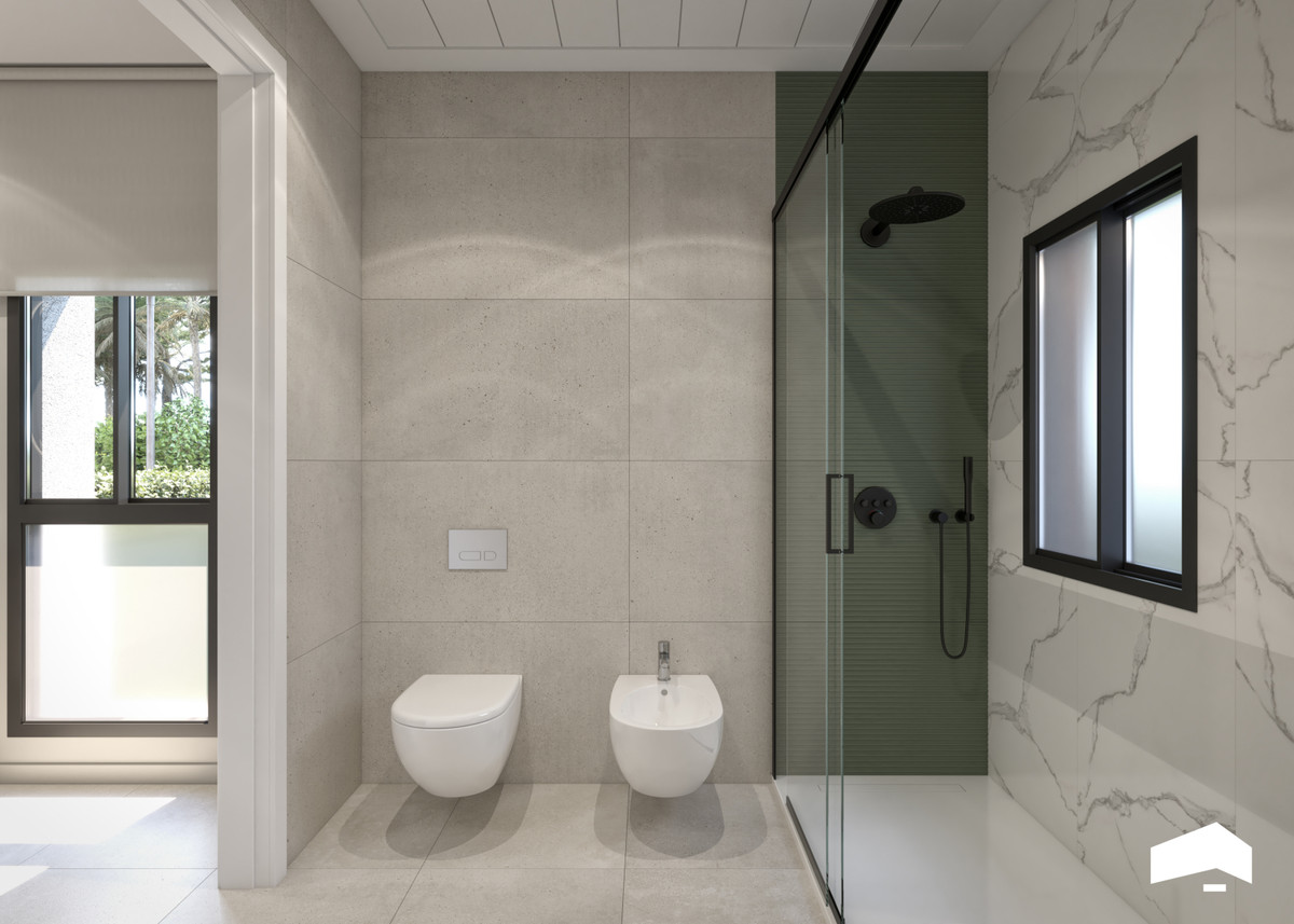 The villas are built over two floors and feature 3 bedrooms, 2 bathrooms, and a guest toilet. They are designed in a contemporary style with an open-concept layout, consisting of a fully equipped kitchen and a combined living-dining room. The villas include fitted wardrobes, a private garden with a pool, off-road parking space, and a private solarium.
