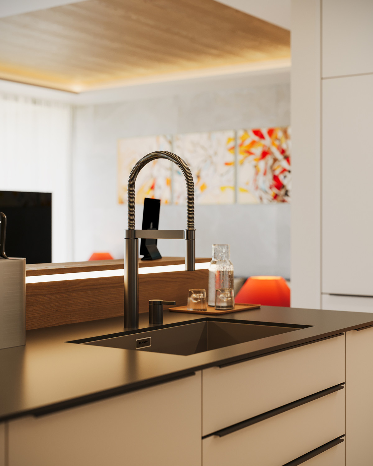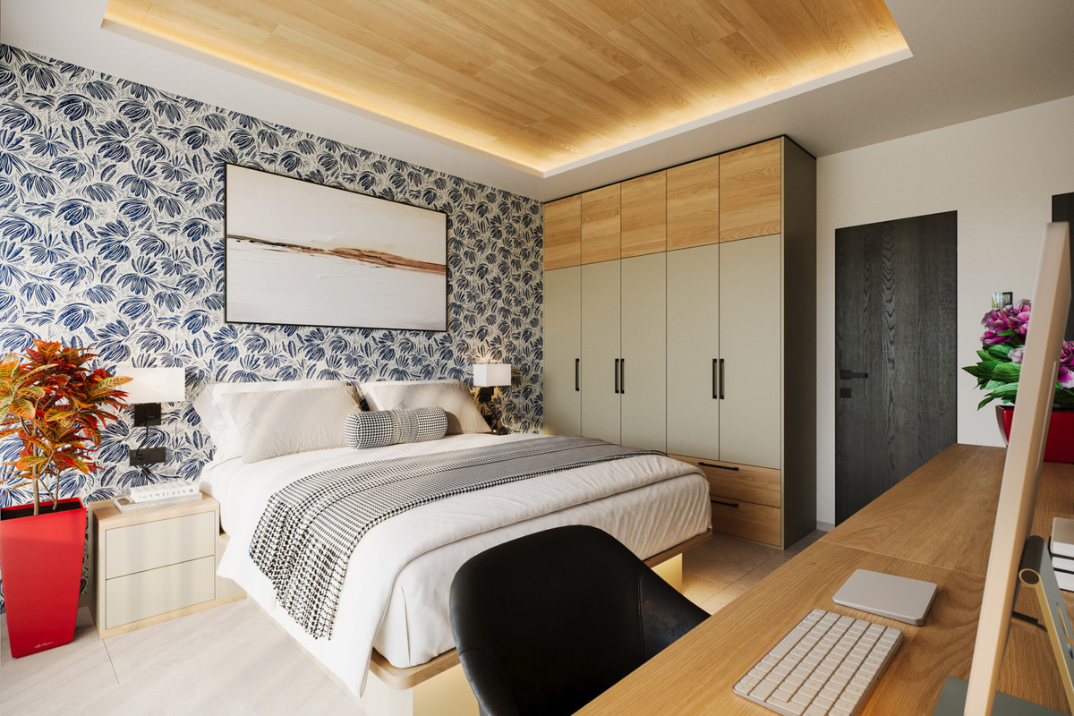 In addition, the villa will be partially furnished with custom-made furniture, which is included in the quoted price. We will be pleased to provide you with a list and technical specifications upon request. Essentially, you will receive all items shown in the visuals, with the exception of the sofa, armchair, chairs, bar stools, mattresses, TV, outdoor furniture, barbecue, and decorations, which can be purchased according to personal preferences.